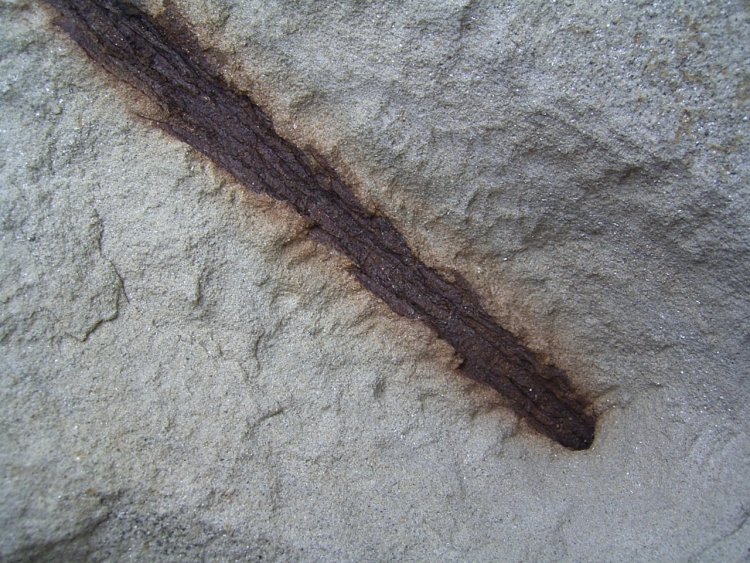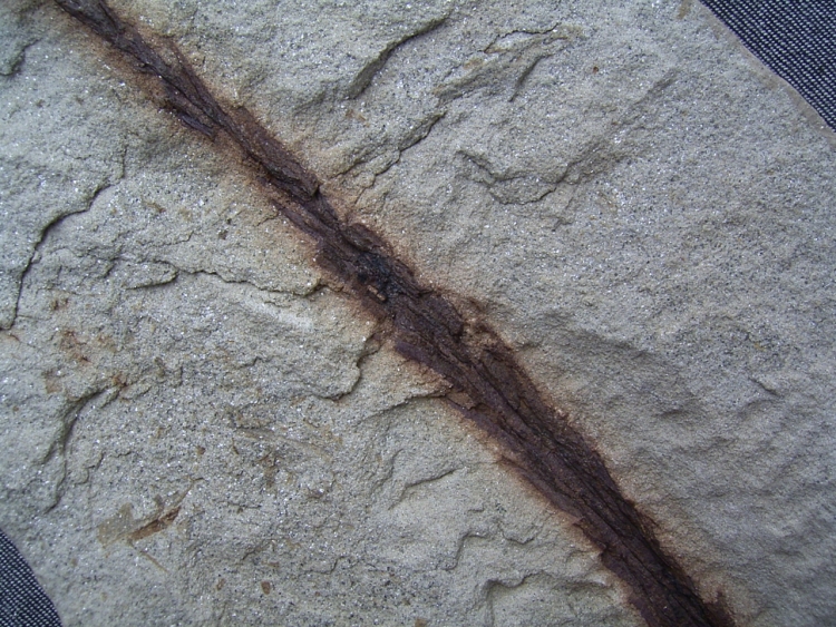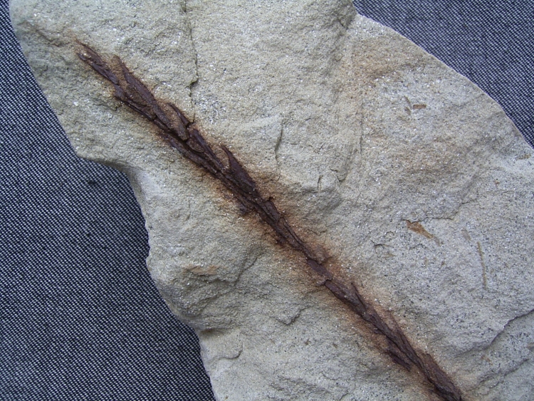 Diese Platte stammt aus der unteren Trias (oberster Buntsandstein) von Petersbach im Elsass, Frankreich. Sie enthält einen Zweig des Nadelbaumes Voltzia.