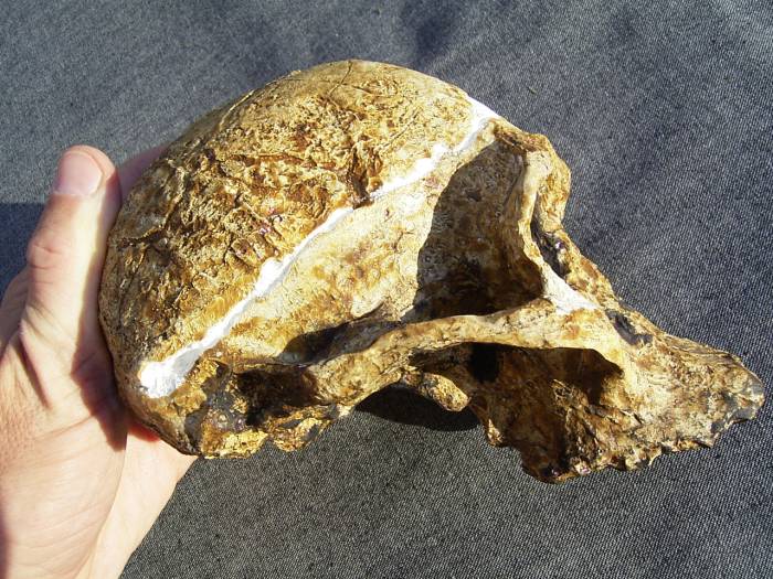 Naturgetreuer Abguss des Hominidenschädels von Australopithecus africanus STS 5, bekannt geworden unter dem Spitznamen "Mrs. Ples". Dieses adulte Cranium wurde am 18. April 1947 von Robert Broom und John T. Robinson in Sterkfontein, Südafrika gefunden und im selben Jahr im Nature Magazin (159;672) veröffentlicht.Das Original befindet sich im Transvaal Museum, Südafrika. Der A. africanus lebte vor 2,5 millionen Jahren, mit dem Fund dieses weltbekannten Fossils wurden die A. africanus erstmals von der internationalen Forschergemeinde als Hominiden anerkannt.