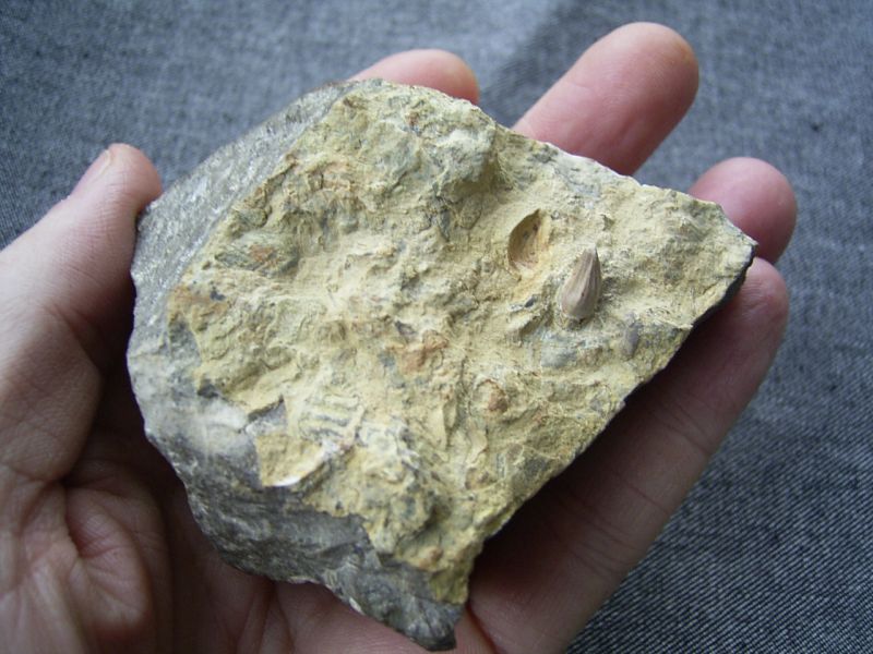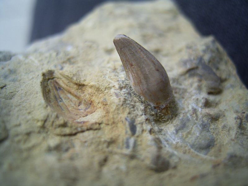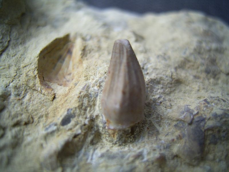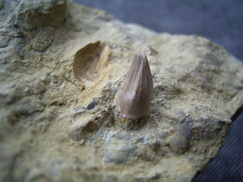 Dieser Zahn eines Simosaurus stammt aus der mittleren Trias (oberer Muschelkalk mo3) von Würzburg.
