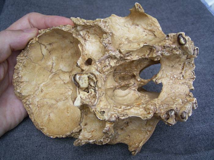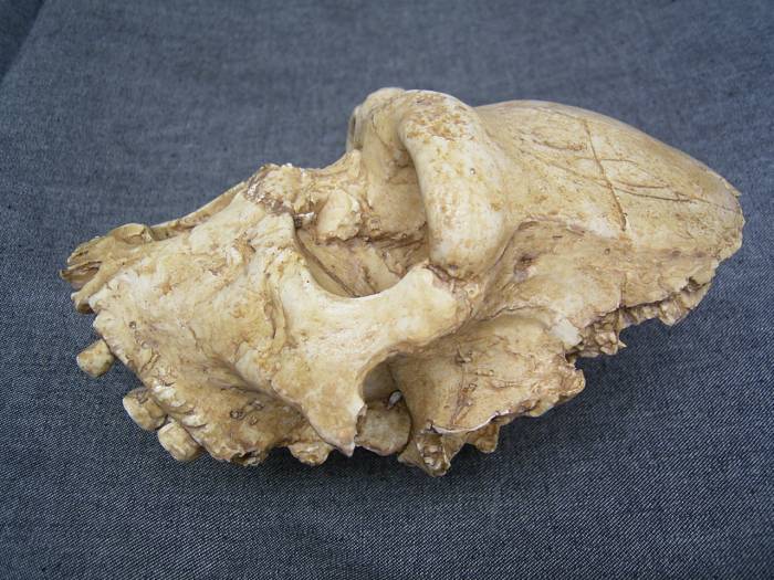 Naturgetreuer Abguss des Gesichtsschädels vom Homo Heidelbergensis, gefunden in der Höhle von Arago, bei Tautavel in den Pyrenäen, Frankreich. Gefunden 1971 von Henry de Lumley und im selben Jahr publiziert als Arago XXI, auch bekannt als Tautavel Mensch.