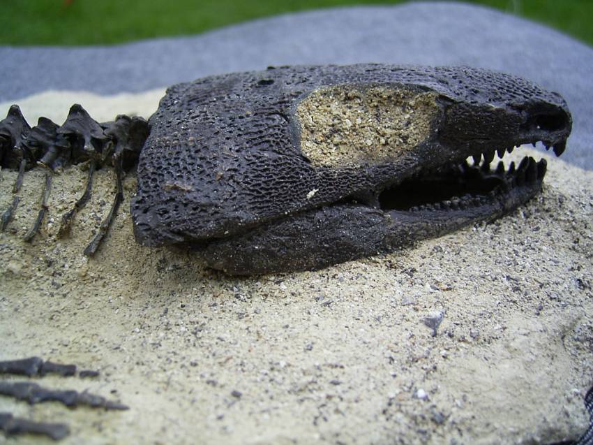Die Matrix wurde künstlich hergestellt. Die Zähne und Knochen sind Originalfossilien!