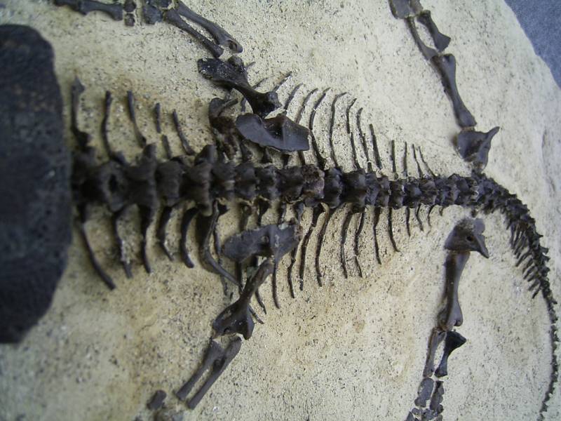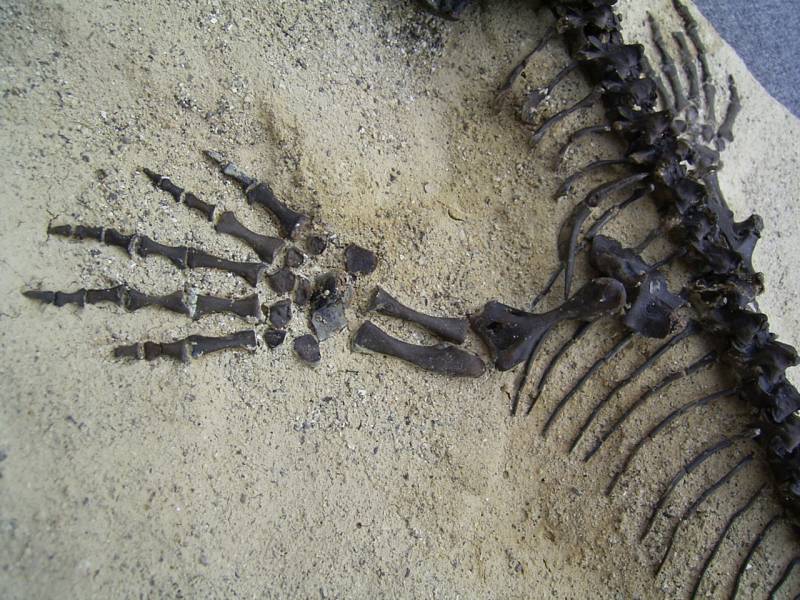 Die Knochen werden in einem "Bone bed" gefunden. Sie liegen kreuz und quer im Gestein. Das letzte Bild zeigt ein Stück dieses Bonebeds (es ist nicht in diesem Angebot enthalten). Wenn sie sich das angesehen haben können sie erahnen wieviel Mühe in diesem Skelett steckt. Mit viel Präparations-Arbeit und Liebe zum Detail kann man die Knochen aus dem Sediment herauslösen und dann zu einem Skelett zusammenfügen.